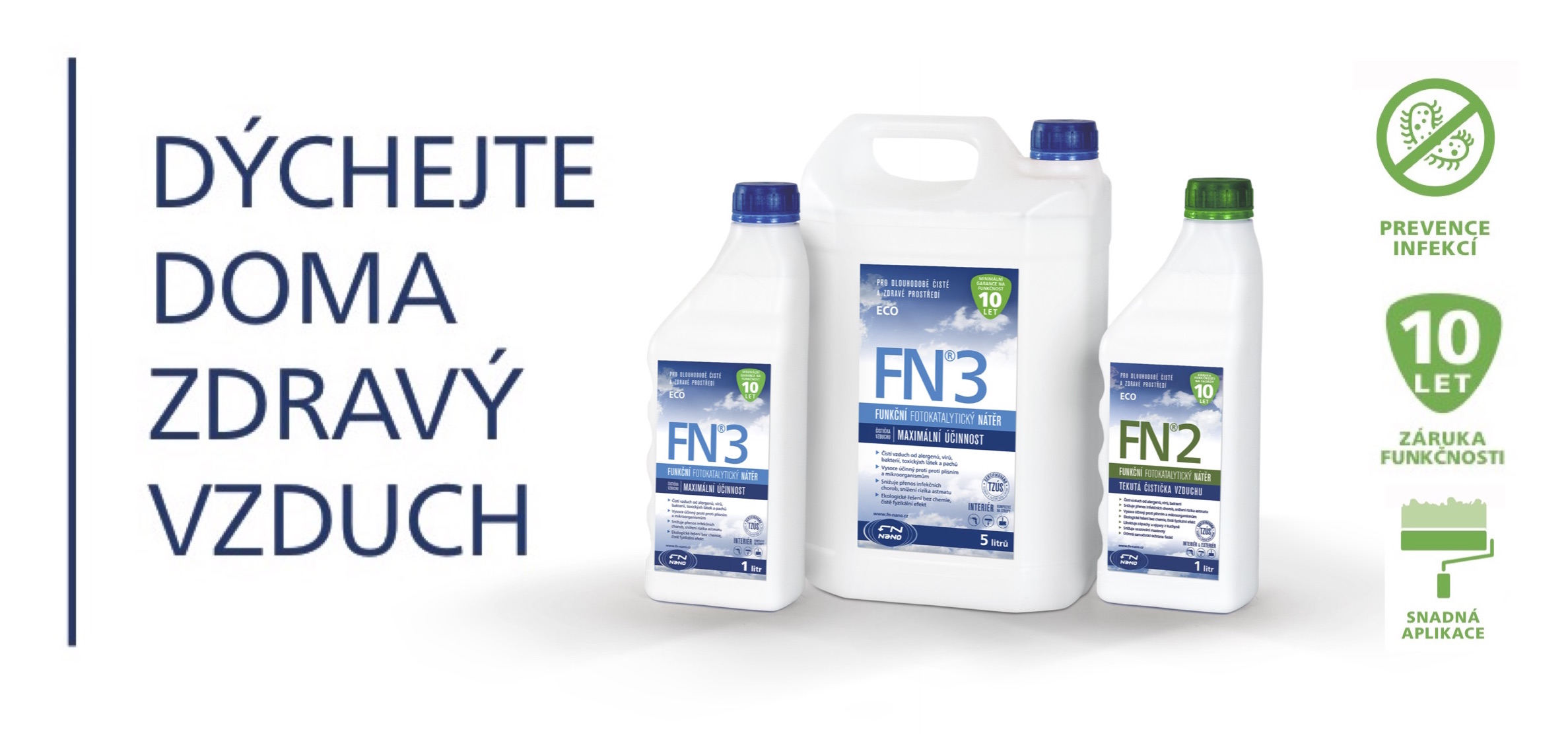 Stačí jenom si ve Vašem domově vymalovat stropy naším fotokatalytickým funkčním nátěrem FN®3,případně jej nasvítit UVA světlem, pokud nemáme možnost přístupu denního světla a Váš domov se stane čistším a zdravějším.